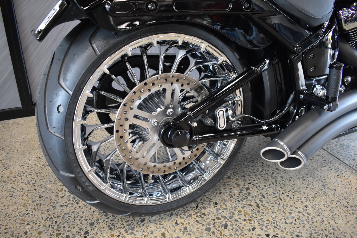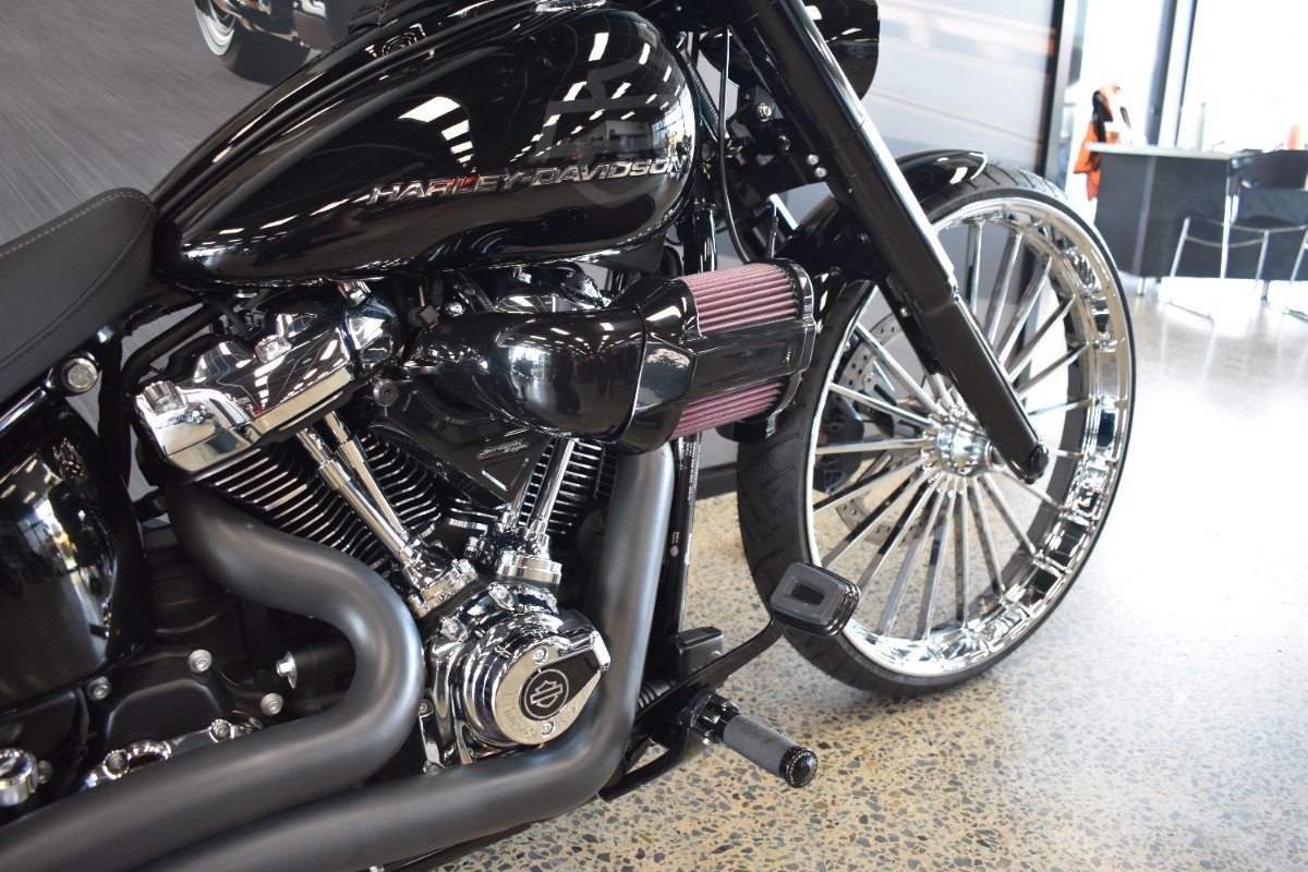 - This is our latest Custom Shop Build. Fitted with a 26-inch Front Custom Wheel with an oversized front disc to match. Genuine Rear Turbine wheel with a chrome pully cover. Screamin Eagle Heavy Breather. The Front end has been fully blacked out. Utilising Freedom Radius 2 into 2 Exhausts in Black for that real Milwaukee 8 Sound. This Breakout has also been fitted with a custom console with Speedo relocation. T Bars with Getta Grips, Inline LED indicators. Mini Oval Mirrors. It has Performance Machine Pegs for the rider and pillion along with Performance machine Shifter. SikTail on the Rear. LED Bullet Headlight. Chrome Flush mount fuel Cap. Figurati Designs Magnetic Dipstick. The name says it all. If you want to Breakout and Break away from the crowds. This is a one of a kind Breakout that will turn heads and let you enjoy the open road.^Ride Away Price with 12 months NSW or Queensland Registration and all the benefits of a New Harley-Davidson.^Call one of our Friendly Sales Staff today to enquire on this New Harley-Davidson to enjoy the ease of Quick turnaround, Great Service, Experienced Workshop, Knowledgeable Parts and Accessories Staff and After Sales Service we all expect.